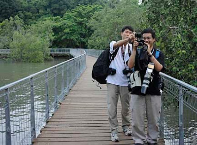 It's a bit of a climb up the wobbly Jejawi Tower but we are rewarded with a great view of the surrounding mangroves and forest. And on the blue horizon, Pulau Tekong. We could barely make out the hills of Johor through the hazy day.Below us, I think it's July leading his group, past the Betel Nut palms and other interesting plants growing next to the Boardwalk. We can't all go up the Tower at the same time so my team heads back down to have a closer look at the mangroves. The melodious song of the Straw-headed bulbul greets us from the forest.